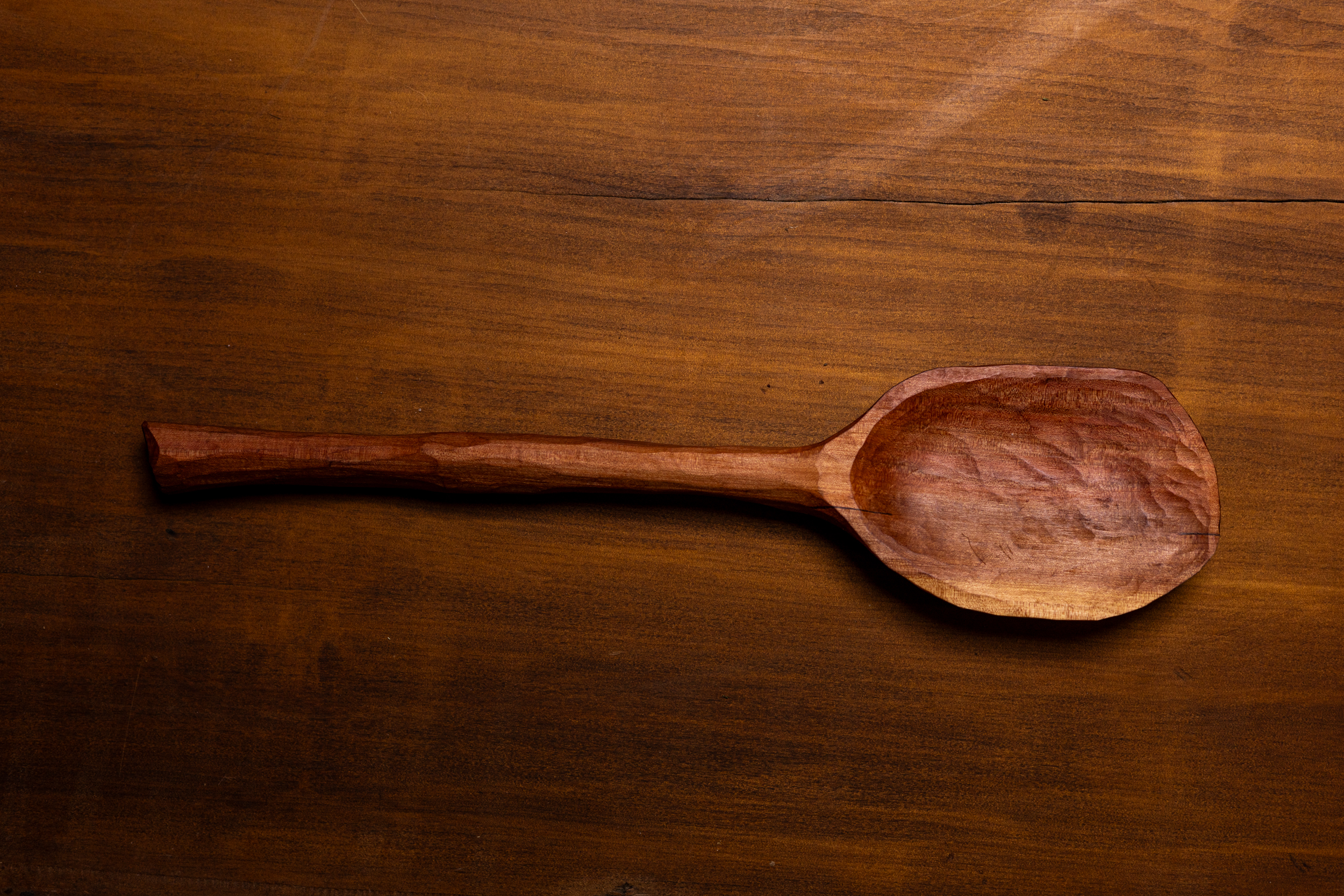 This Native Cherry (Exocarpus cupressiformis) aka Cherry Ballart was hand-carved by me with wood from Chiltern VIC. One of my favourite woods to carve, wiith stunning colour and a good robust weight. I've burnished it with deer antler foraged from the Maragle Valley, in the NSW Snowy Mountains and finished it with hemp oil and Chiltern beeswax.